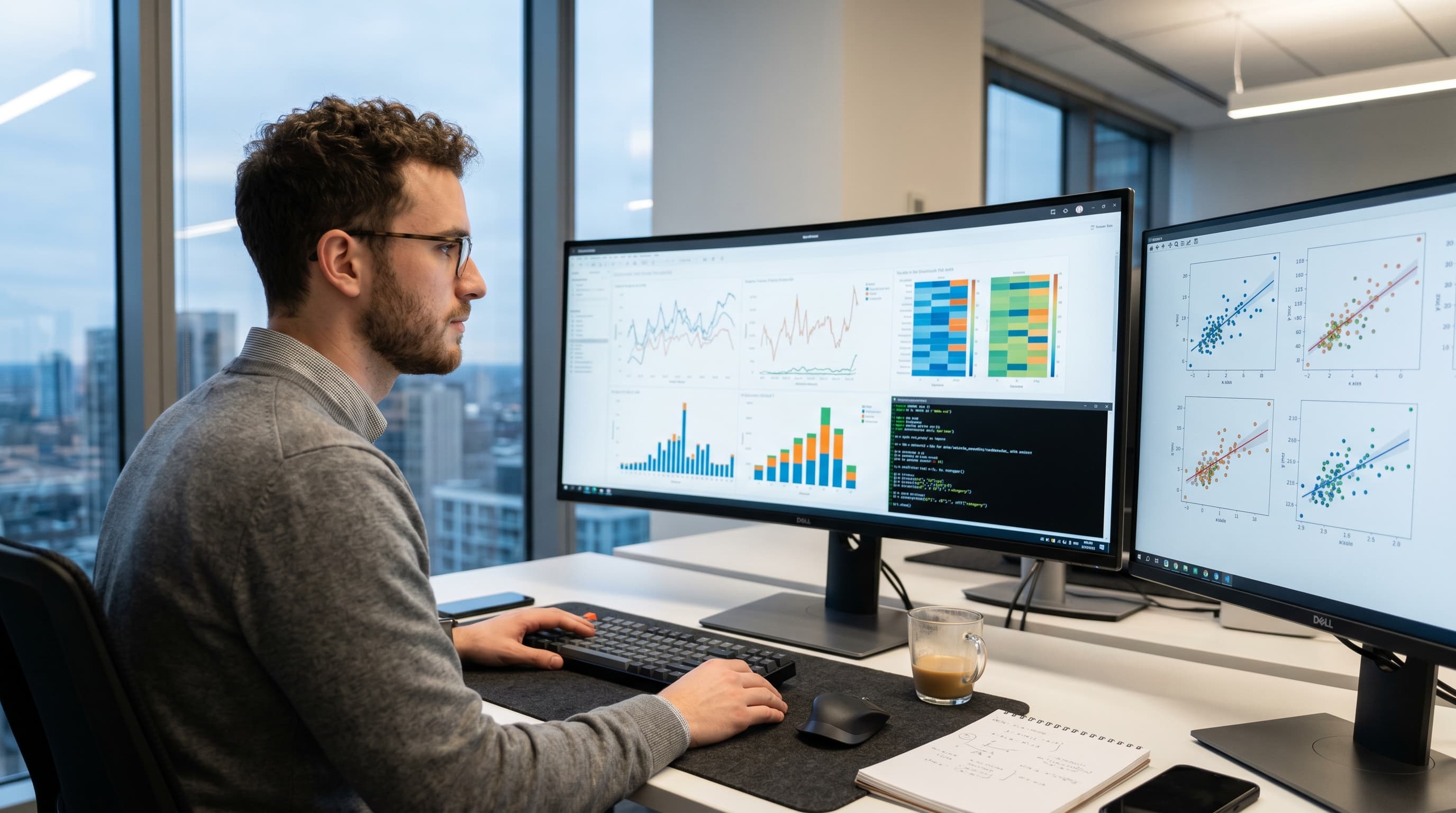 Editorial photograph of a data scientist at a standing desk, large monitor showing a Jupyter notebook with data visualizations (heatmap, retention curve), natural window light, whiteboard with feature importance chart sketched in marker, warm neutral tones, shallow depth of field --ar 16:9 --v 6 --style raw