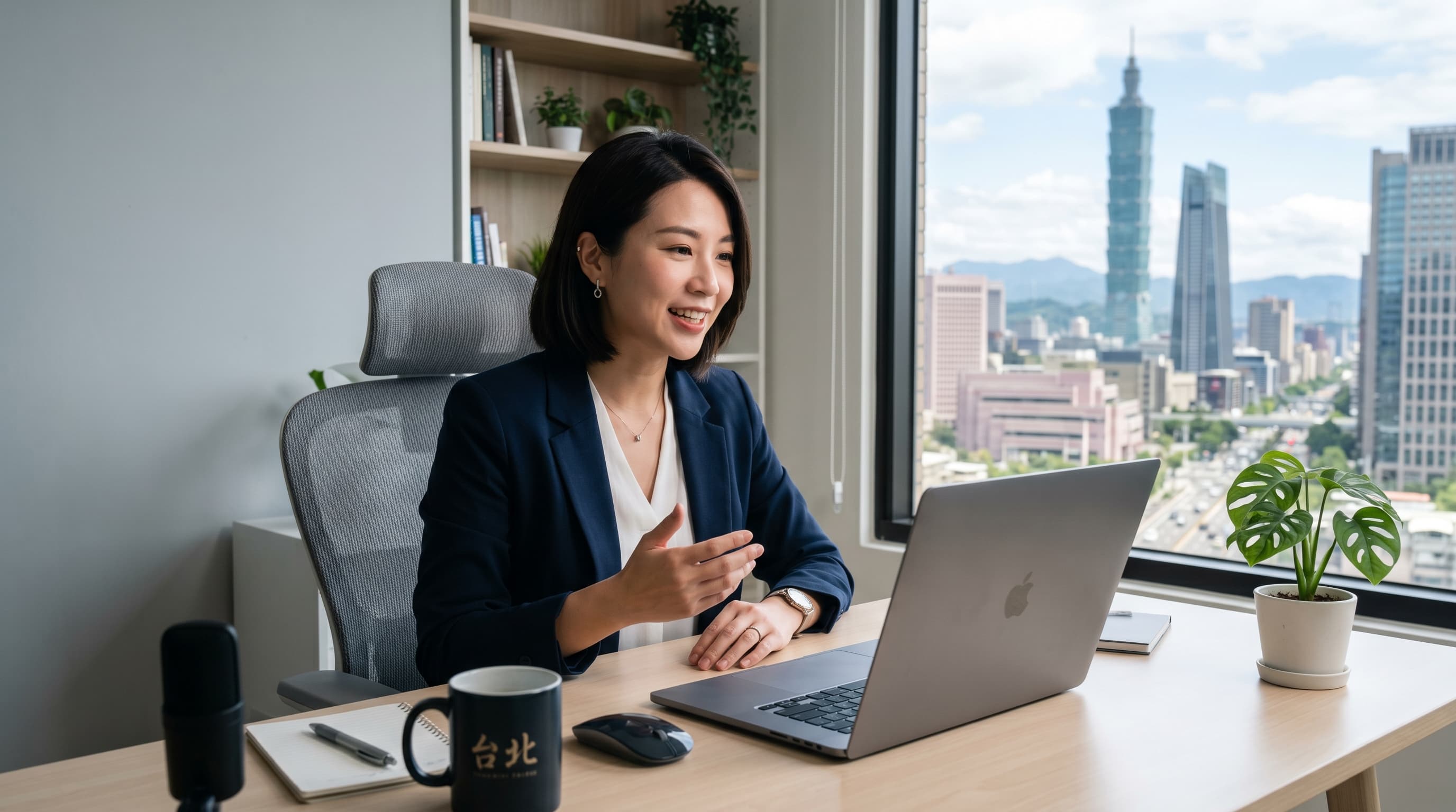 Editorial photograph of a young Taiwanese professional in a video job interview with a foreign tech company, laptop open showing a video call interface, modern minimal home office setup, afternoon light, focused professional expression, warm neutral tones --ar 16:9 --v 6 --style raw