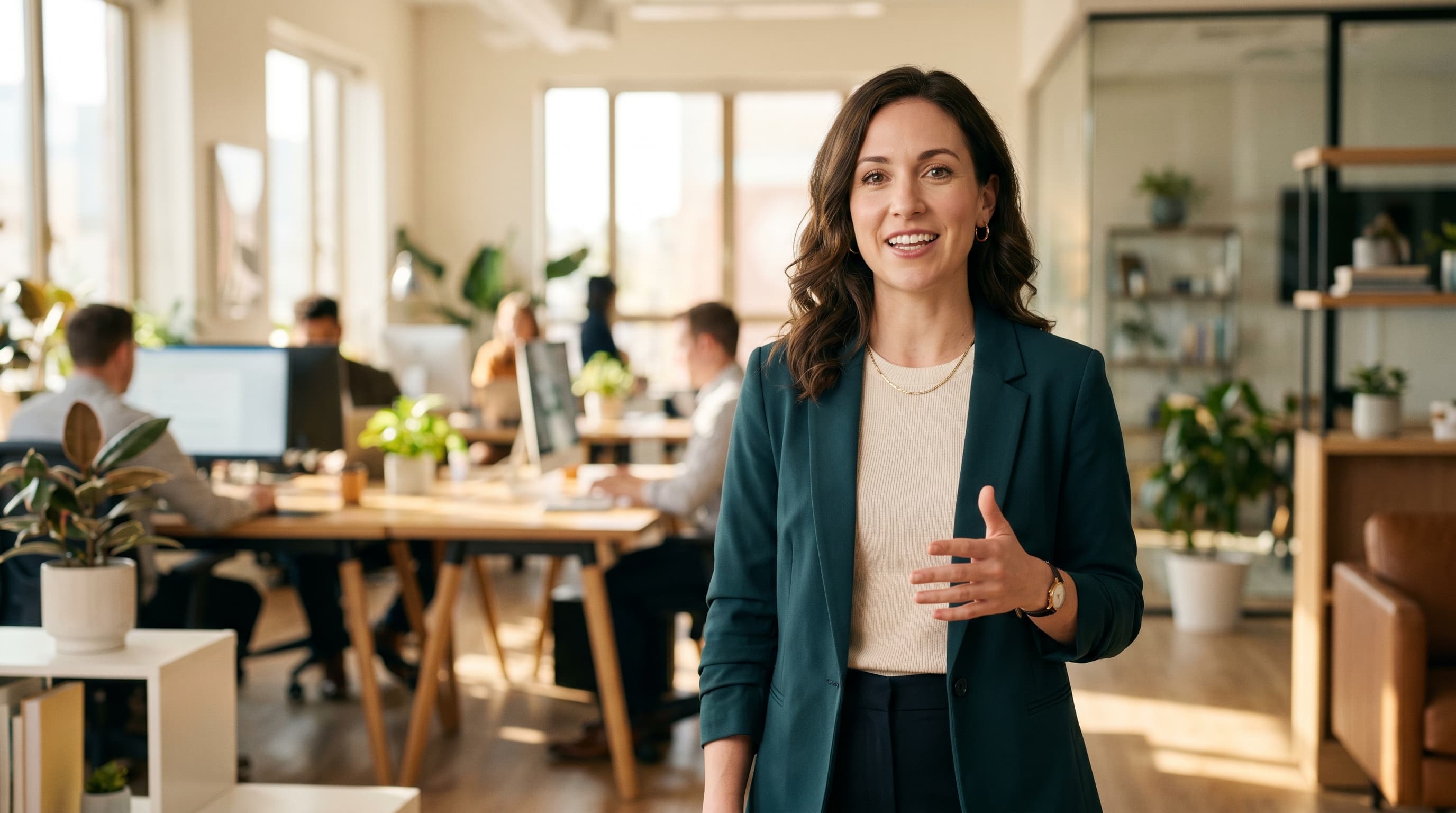 A confident professional mid-sentence during a video interview call, natural window light, warm color grading, shallow depth of field, one hand gesturing mid-explanation, laptop with camera visible, clean home office background, editorial photography style, hopeful optimistic mood --ar 16:9 --v 6 --style raw