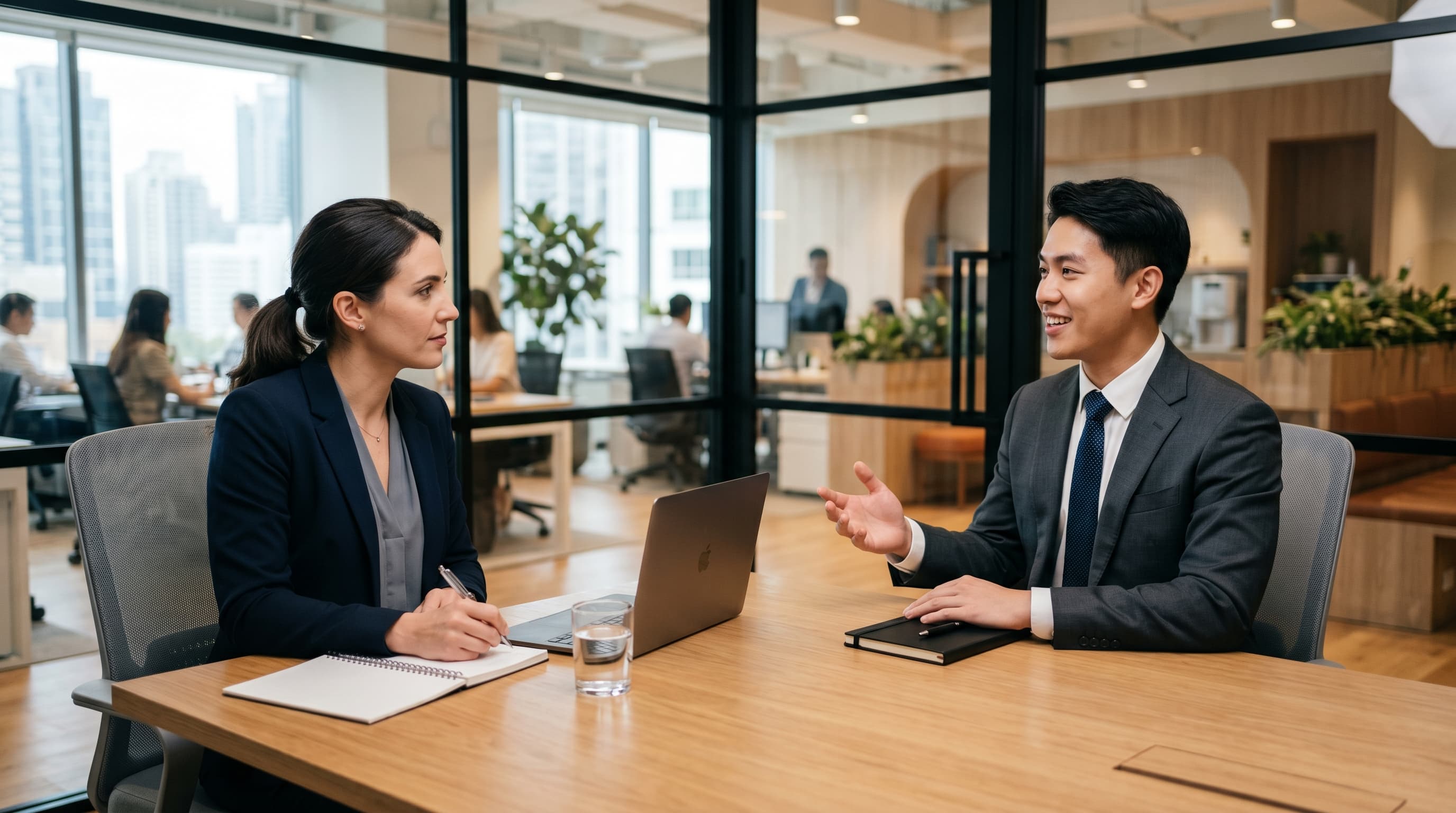 <!-- IMAGE PROMPTS (not for publication) Hero image (Midjourney): Professional interview scene: two people seated across a glass table in modern office meeting room, candidate answering question with confident posture, notebook on desk, soft natural window lighting, neutral and encouraging atmosphere, photorealistic --ar 16:9 --style raw --v 6 STAR framework illustration (Ideogram): Clean infographic showing STAR framework as 4 connected circles labeled Situation, Task, Action, Result, flowing left to right, with added R² Reflection circle at the end. Blue gradient color scheme, minimal and modern design. 30 questions overview (DALL-E 3): Grid layout graphic showing 9 category icons for behavioral interview question types: leadership, conflict, failure, decisions, collaboration, customer, strategy, fit, self-awareness. Flat minimal icons, blue and teal palette, clean educational graphic. -->Ready to practice?