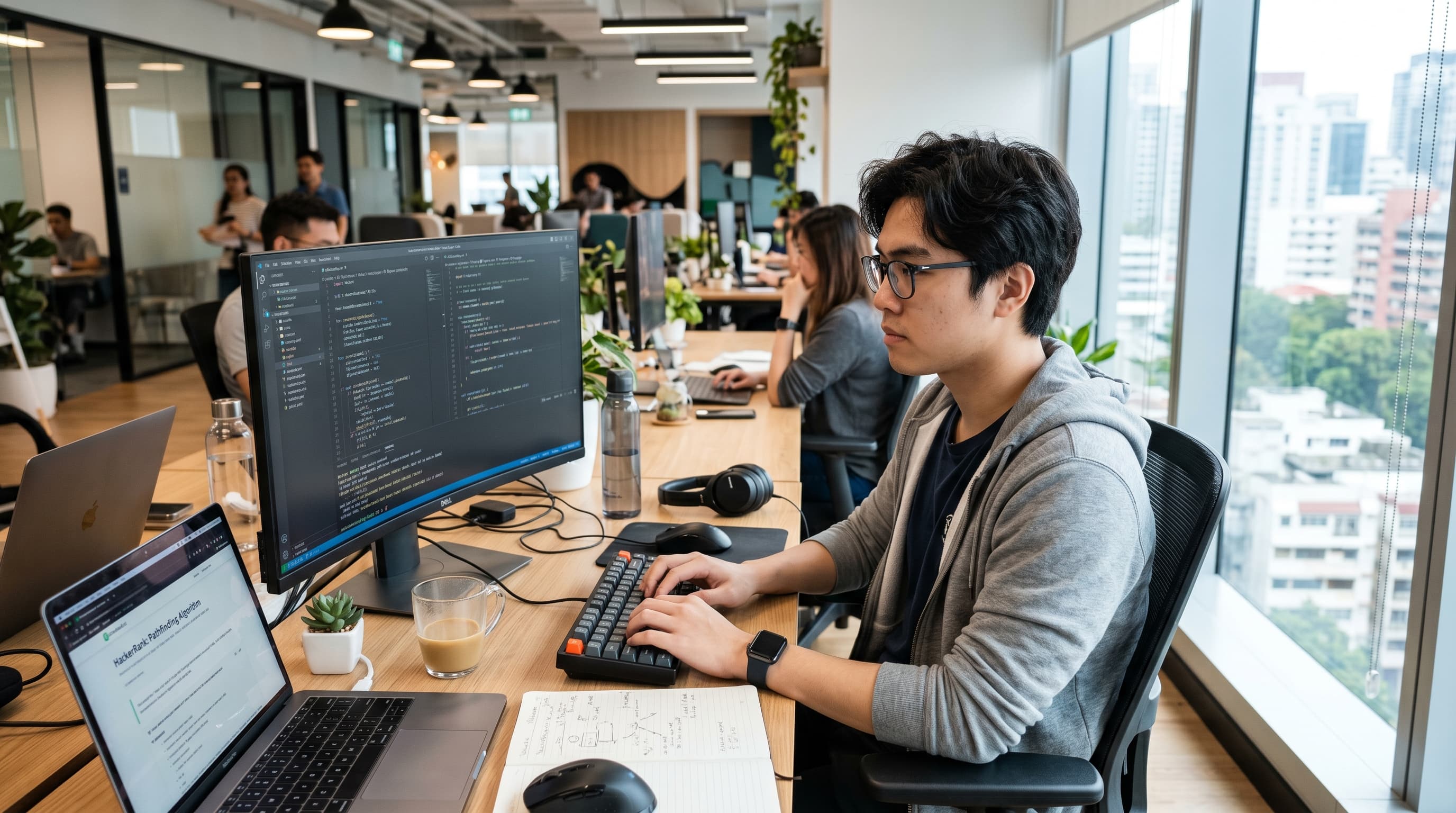 Editorial photograph of a Taiwanese software engineer preparing for a job interview, minimalist desk with MacBook showing code editor, sticky notes with algorithm diagrams, warm afternoon light, modern Taipei apartment aesthetic, focused calm mood --ar 16:9 --v 6 --style raw